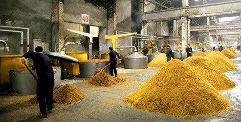 4.原料处理无论是酿造酒,还是蒸馏酒,以及两者的派生酒品,制酒用的主要原料均为糖质原料或淀粉质原料。为了充分利用原料,提高糖化能力和出酒率,并形成特有的酒品风格,酿酒的原料都必须经过一系列特定工艺的处理,主要包括原料的选择配比及其状态的改变等。环境因素的控制也是关键的环节。 糖质原料以水果为主,原料处理主要包括根据成酒的特点选择品种、采摘分类、除去腐烂果品和杂质、破碎果实、榨汁去梗、澄清抗氧、杀菌等。 淀粉质原料以麦芽、米类、薯类、杂粮等为主,采用复式发酵法,先糖化、后发酵或糖化发酵同时进行。原料品种及发酵方式的不同,原料处理的过程和工艺也有差异性。中国广泛使用酒曲酿酒,其原料处理的基本工艺和程序是精碾或粉碎,润料(浸米),蒸煮(蒸饭),摊凉(淋水冷却),翻料,入缸或入窖发酵等。